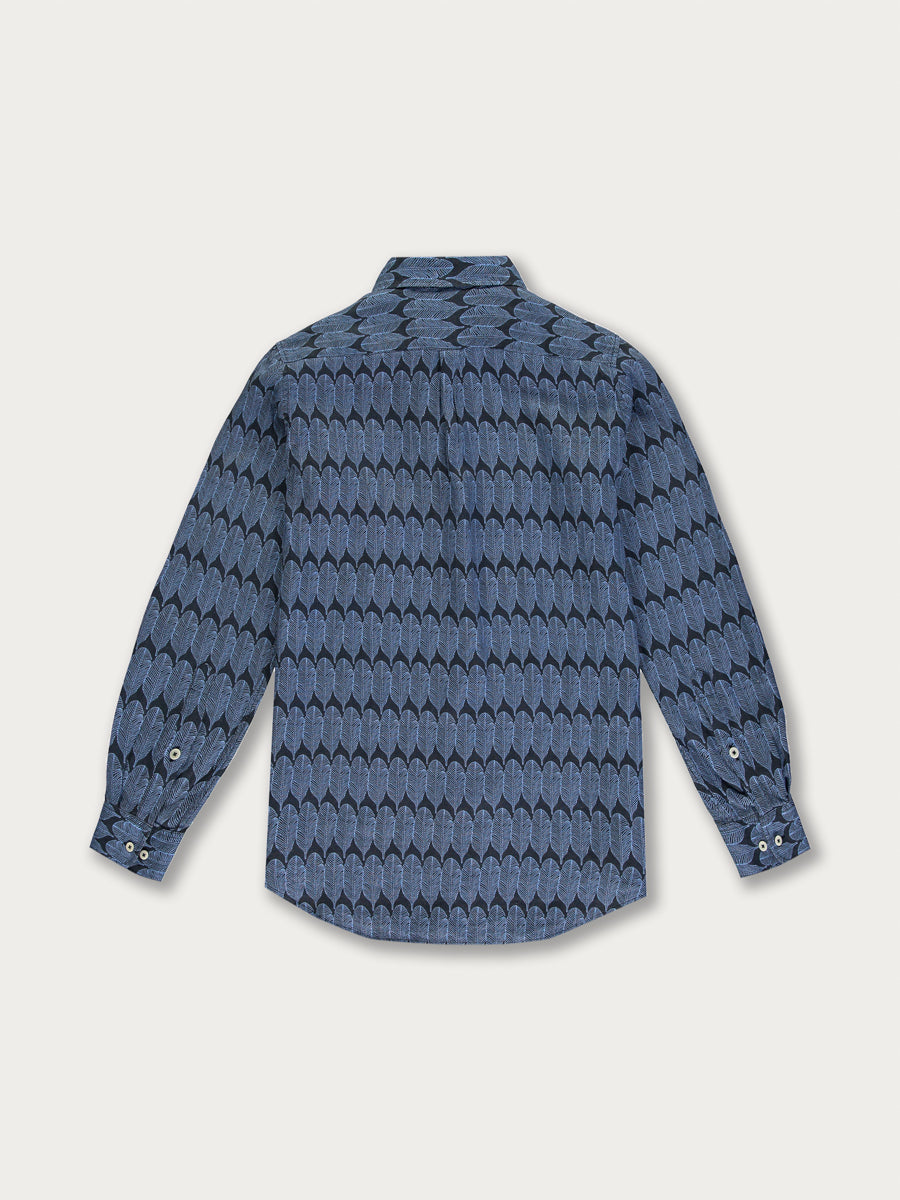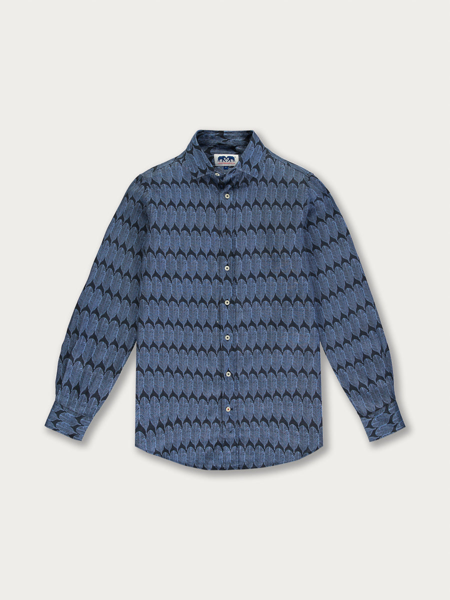 The print on this navy linen shirt is inspired by the conservation work of our partner charity Elephant Family and one man in particular, Dulu, who has dedicated his life to helping wild elephants.