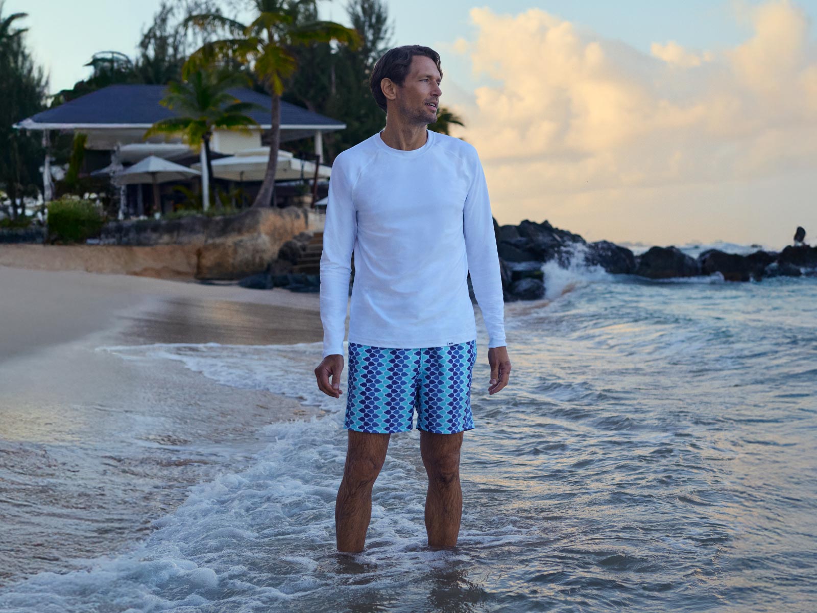 Keep it simple up top. Pair printed swim shorts with a plain linen shirt or cotton tee to balance the look. Add espadrilles, a cap and sunglasses for effortless holiday style.